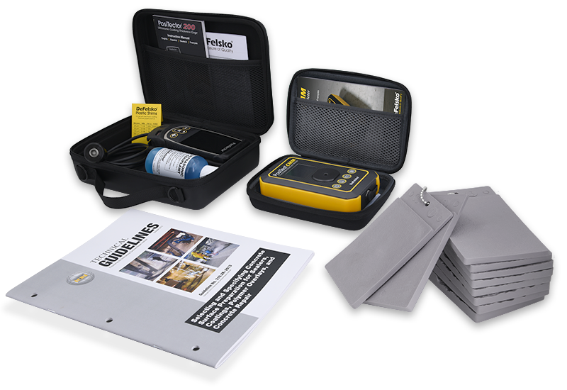 Each Concrete Inspection Kit contains: PosiTector Gage Body (Standard or Advanced), PosiTector 200 Ultrasonic Coating Thickness Probe (select from a PRB200C and PRB200D), PosiTest CMM Concrete Moisture Meter (CMM), and ICRI Concrete Surface Profile Chips with Technical Guide (CSPTG). Select from 4 pre-configured kits or build a custom inspection kit.