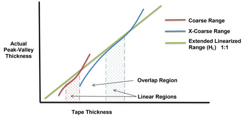 Inside the primary range, Coarse and X-Coarse tape share a 38 - 64 μm (1.5 - 2.5 mils) "overlap" region. Measurements with conventional micrometers require a complicated and time consuming procedure of averaging one reading using Coarse grade and one reading using X-Coarse grade to achieve reasonable accuracy.