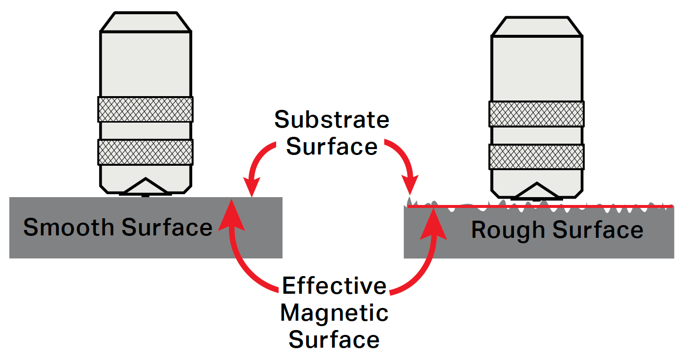 All coating thickness gages are influenced to some degree by substrate roughness, as shown in the below image. It is generally accepted that coating thickness should be measured from the highest ‘peaks’ in the rough surface thus ensuring they are covered by the protective coating. However, coating thickness gages will instead measure the coating thickness from the ‘effective magnetic plane, which is located somewhere between the highest peaks and deepest valleys of the profile.