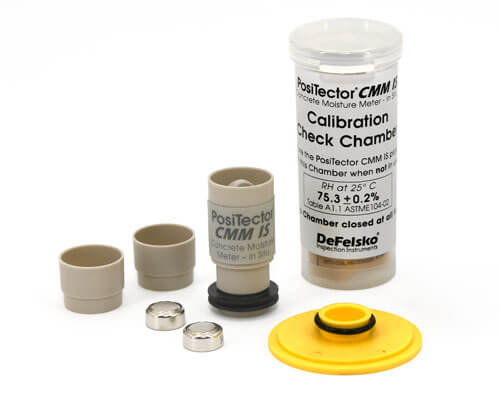 The PosiTector CMM IS In Situ Concrete Moisture Meter is the simple, durable and accurate way to measure concrete relative humidity in accordance with ASTM F2170. Each reusable NIST-traceable probe includes a calibration check salt and chamber for conditioning and storage. Probes feature auto-pairing Bluetooth Low Energy (BLE) wireless technology and transmit concrete moisture measurements to a smartphone operating the free PosiTector App (iOS and Android compatible) or to a PosiTector Advanced gage (serial numbers 784,000 and greater).